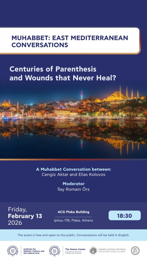 Την Παρασκευή, 13 Φεβρουαρίου 2026, ώρα 18:30, στο The Demos Center, Ηπίτου 17, Πλάκα, Αθήνα, θα διεξαχθεί η επόμενη συνάντηση του νέου κύκλου της πρωτοβουλίας Muhabbet: Συζητήσεις για την Ανατολική Μεσόγειο, την οποία συνδιοργανώνει το Ινστιτούτο Ιστορικών Ερευνών του Ε.Ι.Ε., μαζί με το Institute of Hellenic Culture and Liberal Arts, The American College of Greece, και την Γεννάδειο Βιβλιοθήκη, Αμερικανική Σχολή Κλασικών Σπουδών στην Αθήνα.