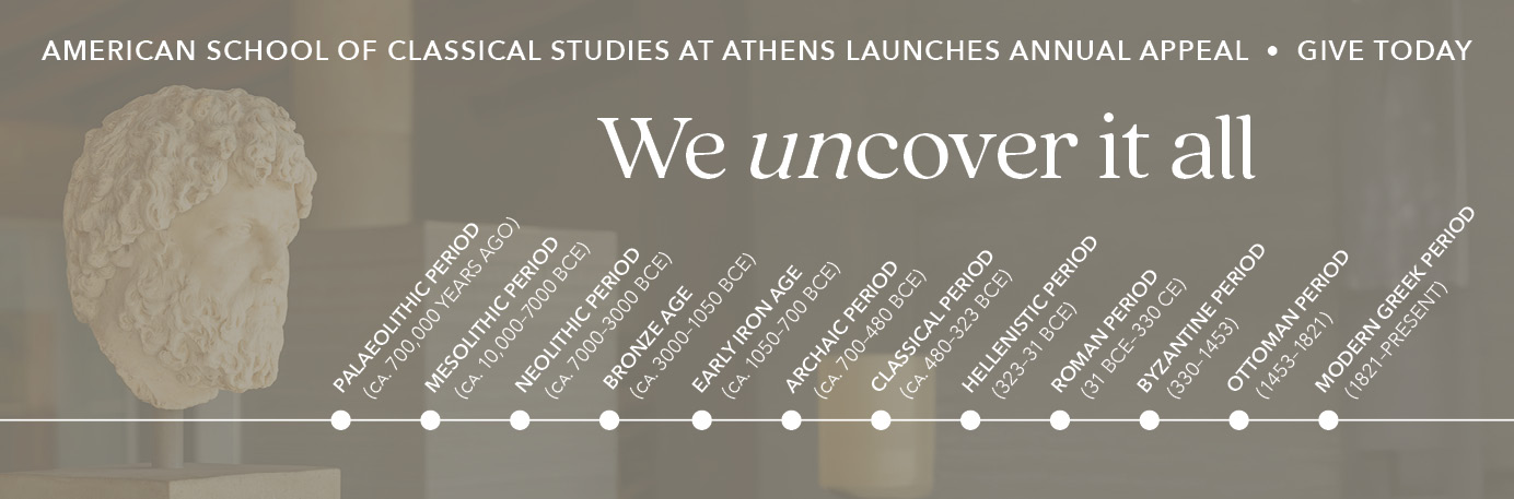 The Trustees of the American School of Classical Studies at Athens invite you to join them in supporting our historic institution. In addition to funding other programs and projects, the Trustees have contributed almost half of this year’s Annual Appeal goal.
