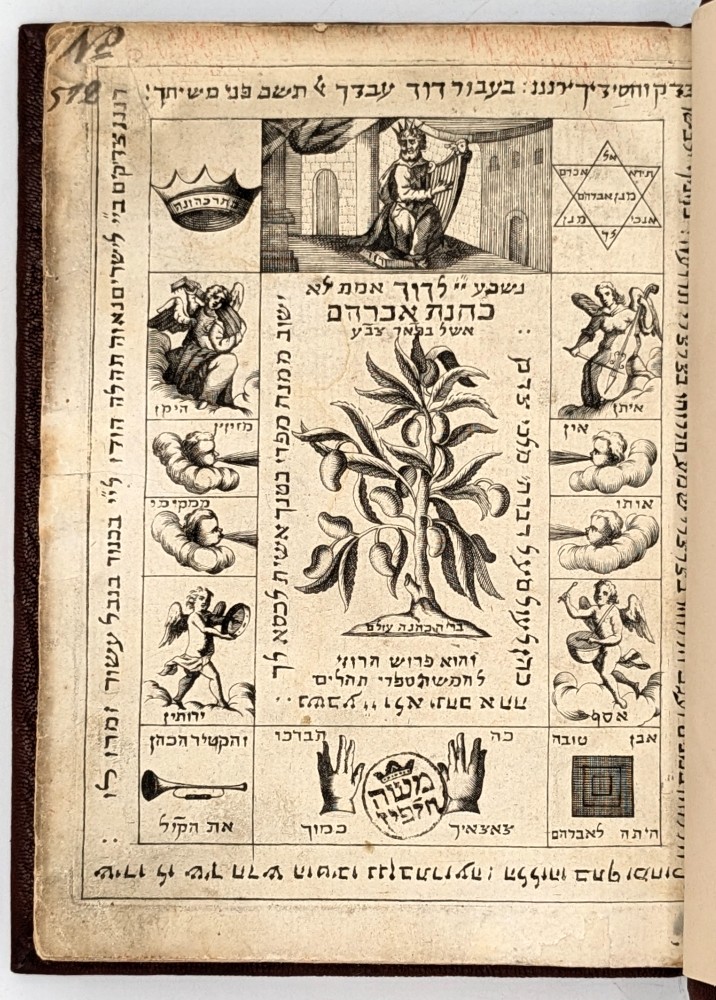 The engraved plates that accompany this edition enhance its singularity. The author’s portrait, produced specifically for the book, depicts Cohen at the age of 47 wearing a luxurious wig and frock coat, his clean-shaven face indistinguishable from that of a Venetian Enlightenment intellectual. The legend surrounding his likeness styles him “Philosopher, Physician, and Rabbi,” while beneath are terse Latin and Hebrew mottos. An allegorical frontispiece centers on the Tree of Knowledge, crowned by King David with his harp, surrounded by vignettes of biblical poets and ritual symbols. Most extraordinary for a Hebrew book of the period is the engraved plate illustrating the fifth day of Creation, which accompanies Cohen’s versified Perek Shirah.