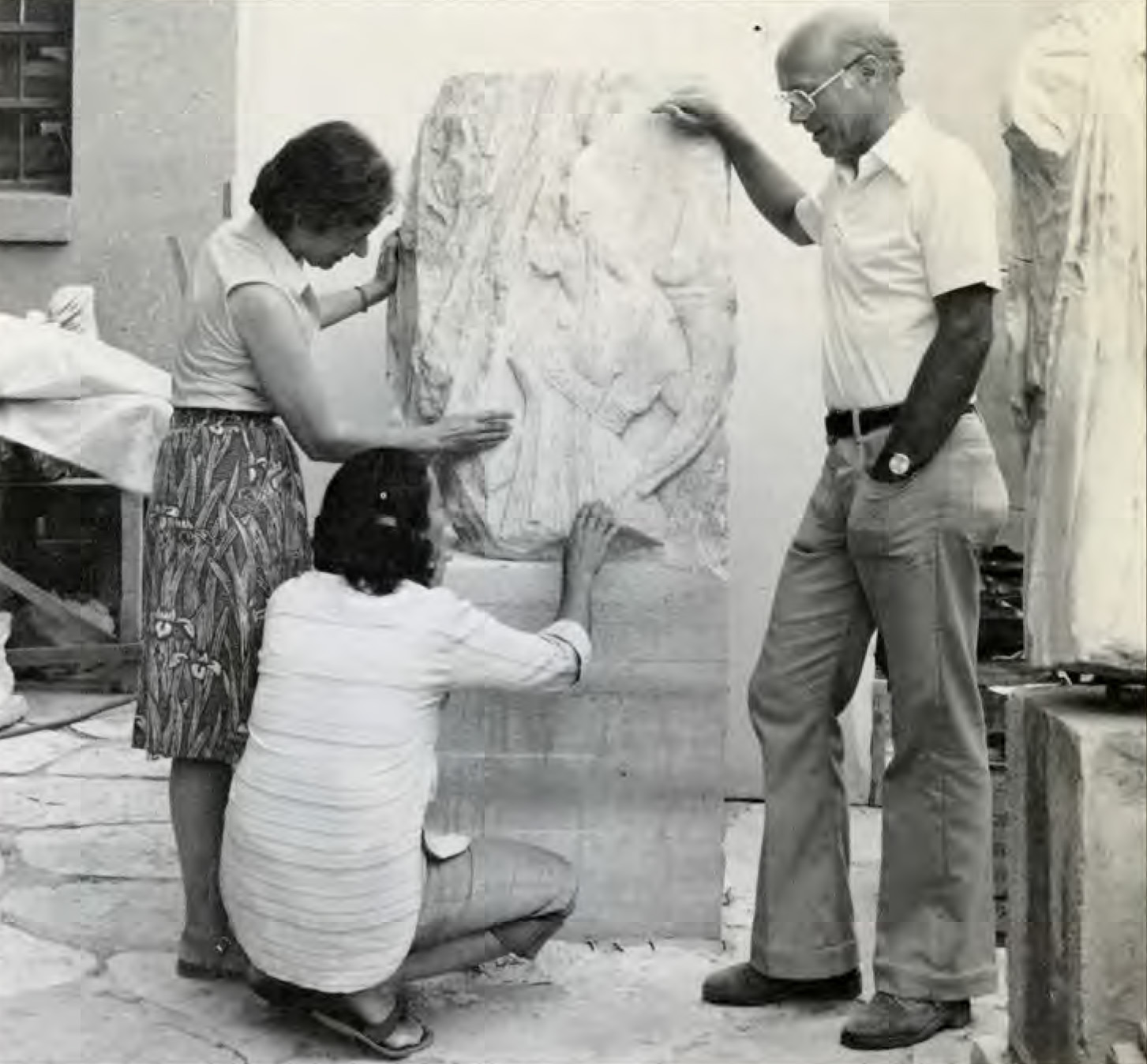 Nancy Bookidis, Stella Bouzakis and Charles K. Williams II, with relief of three Gods, 1977