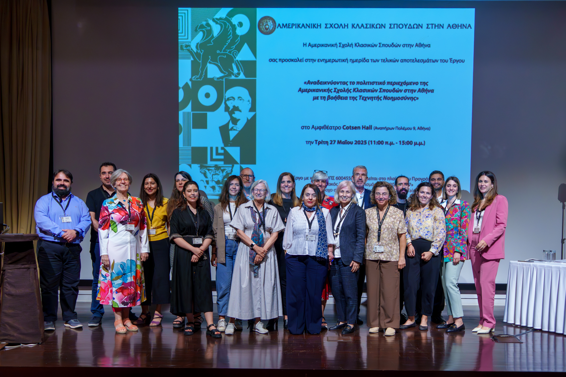 Με απόλυτη επιτυχία πραγματοποιήθηκε την Τρίτη 27 Μαΐου 2025, στο αμφιθέατρο Cotsen Hall της Αμερικανικής Σχολής Κλασικών Σπουδών στην Αθήνα (ASCSA), η τελική ημερίδα παρουσίασης των αποτελεσμάτων του έργου «Αναδεικνύοντας το πολιτιστικό περιεχόμενο της Αμερικανικής Σχολής με τη βοήθεια της Τεχνητής Νοημοσύνης», σηματοδοτώντας την ολοκλήρωση μίας καινοτόμου και πολυδιάστατης προσπάθειας για την αξιοποίηση της ψηφιακής τεχνολογίας στον τομέα του πολιτισμού.
