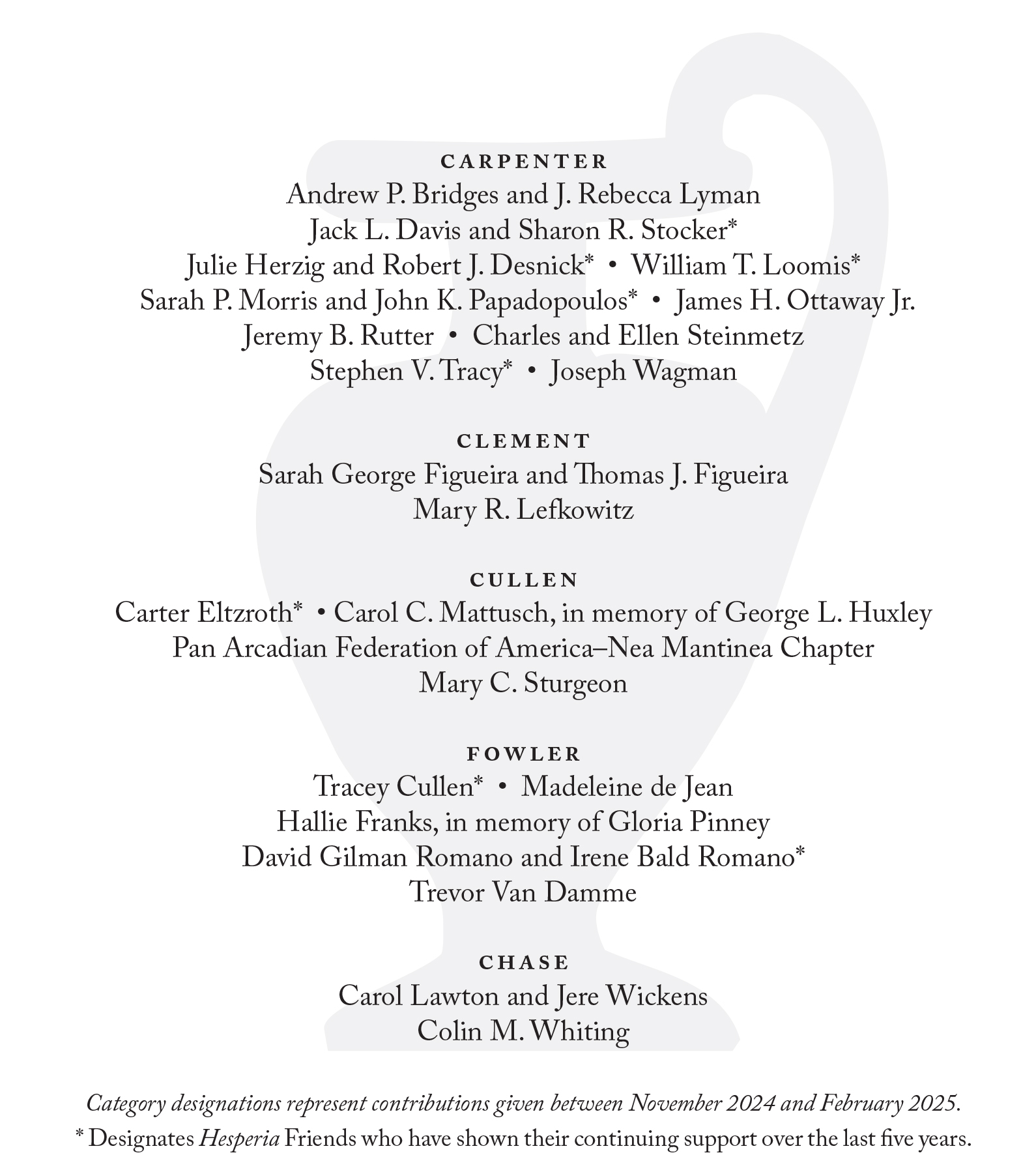 Contributions are welcome in any amount and are tax deductible. Levels of giving are named after some of the ASCSA’s past editors: McAllister: $25, Chase: $50, Fowler: $100, Cullen: $250, Clement: $500, Capps: $750, Carpenter: $1,000, Meritt: $2,500, Shoe: $5,000, Pierce Blegen: $10,000.