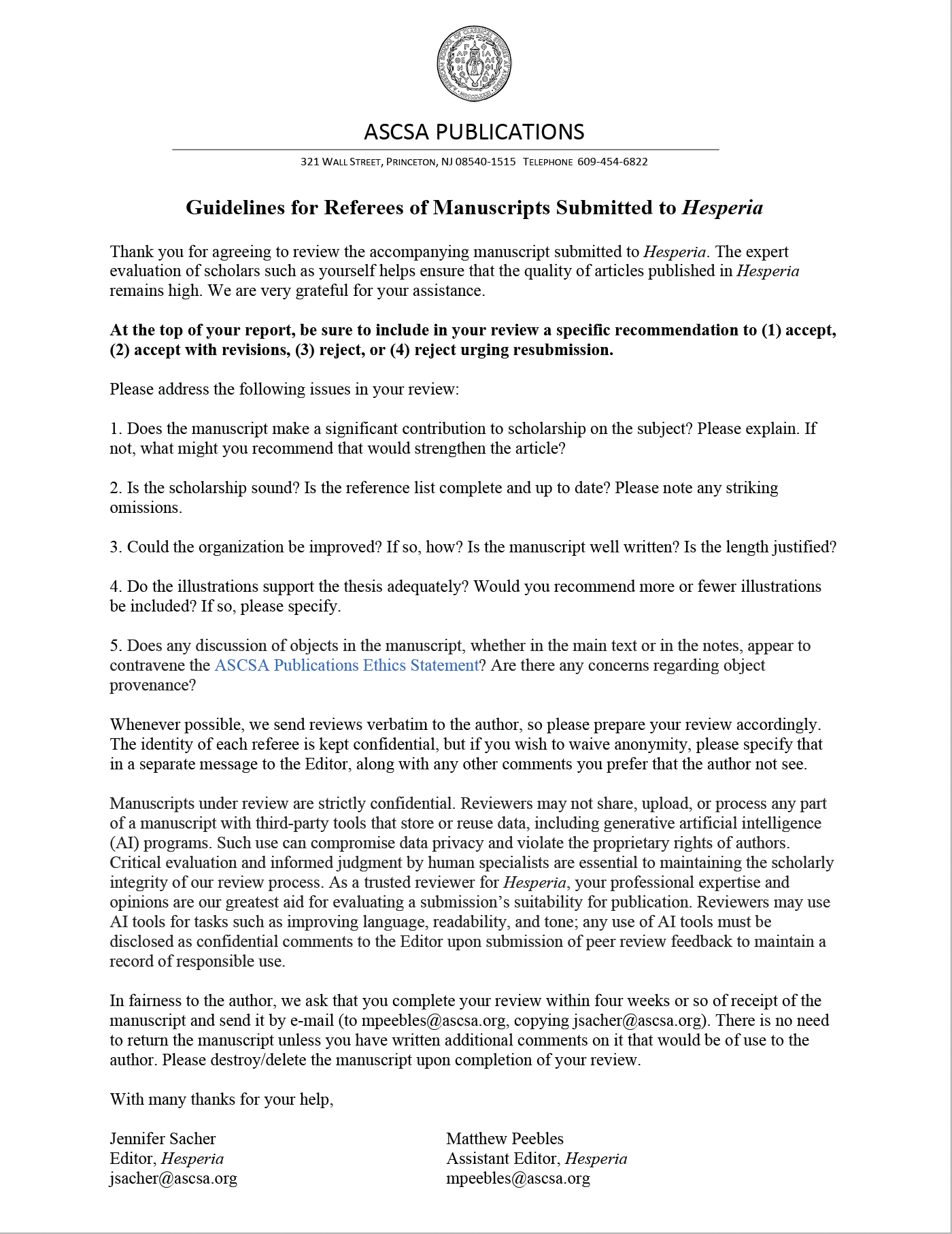 Hesperia conducts double-anonymized peer review. Copies of the manuscript are sent to two outside referees. The review process may take up to three to four months. Delays are possible due to the continuing effects of the pandemic. After the reviews are received, authors are advised of the Editor’s decision to accept, reject, or request changes to the article, and of the substance of the referees’ comments. In the case of conflicting reviews, the Editor may solicit an additional review, which could add time to the review process.