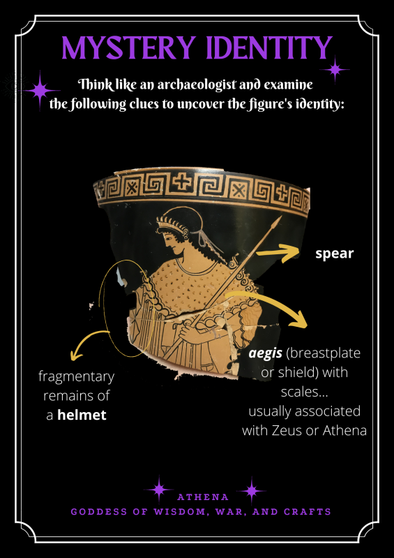 Most Ancient Greek statues and vase paintings do not list the names of the figures depicted. Archaeologists have to look for clues in order to identify them. Gods and goddesses had certain attributes, or characteristics, that were unique to them. Therefore, when archaeologists identify these attributes, they can almost certainly assign a name to the figure.