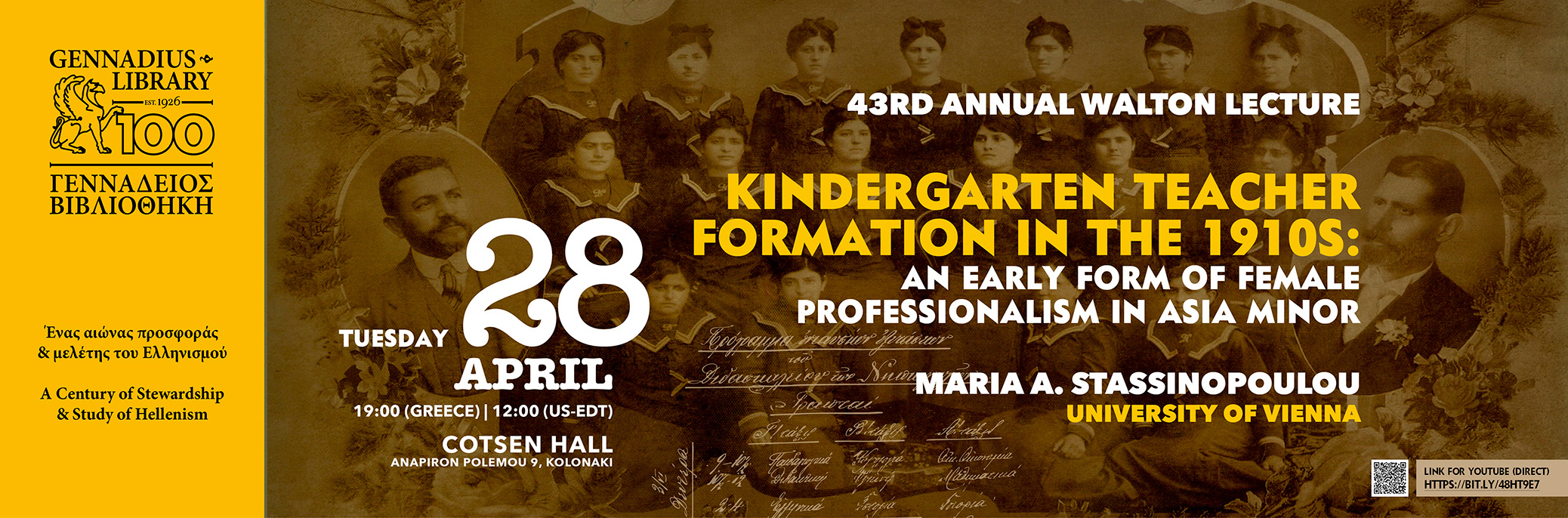 Η Γεννάδειος Βιβλιοθήκη συμμετέχει στον Περίπατο Βιβλίου, που θα πραγματοποιηθεί το Σάββατο 25 Απριλίου. Συμμετέχει στη δράση με την έκθεση «Γεννάδειος 100. Ένας Αιώνας Έμπνευσης», που θα είναι ανοικτή για το κοινό 12.00-18.00. Το διάστημα 13.00-14.00 θα γίνει ξενάγηση από την Ειρήνη Σολομωνίδη, Επικεφαλής Βιβλιοθηκάριο και μία εκ των επιμελητριών της έκθεσης.