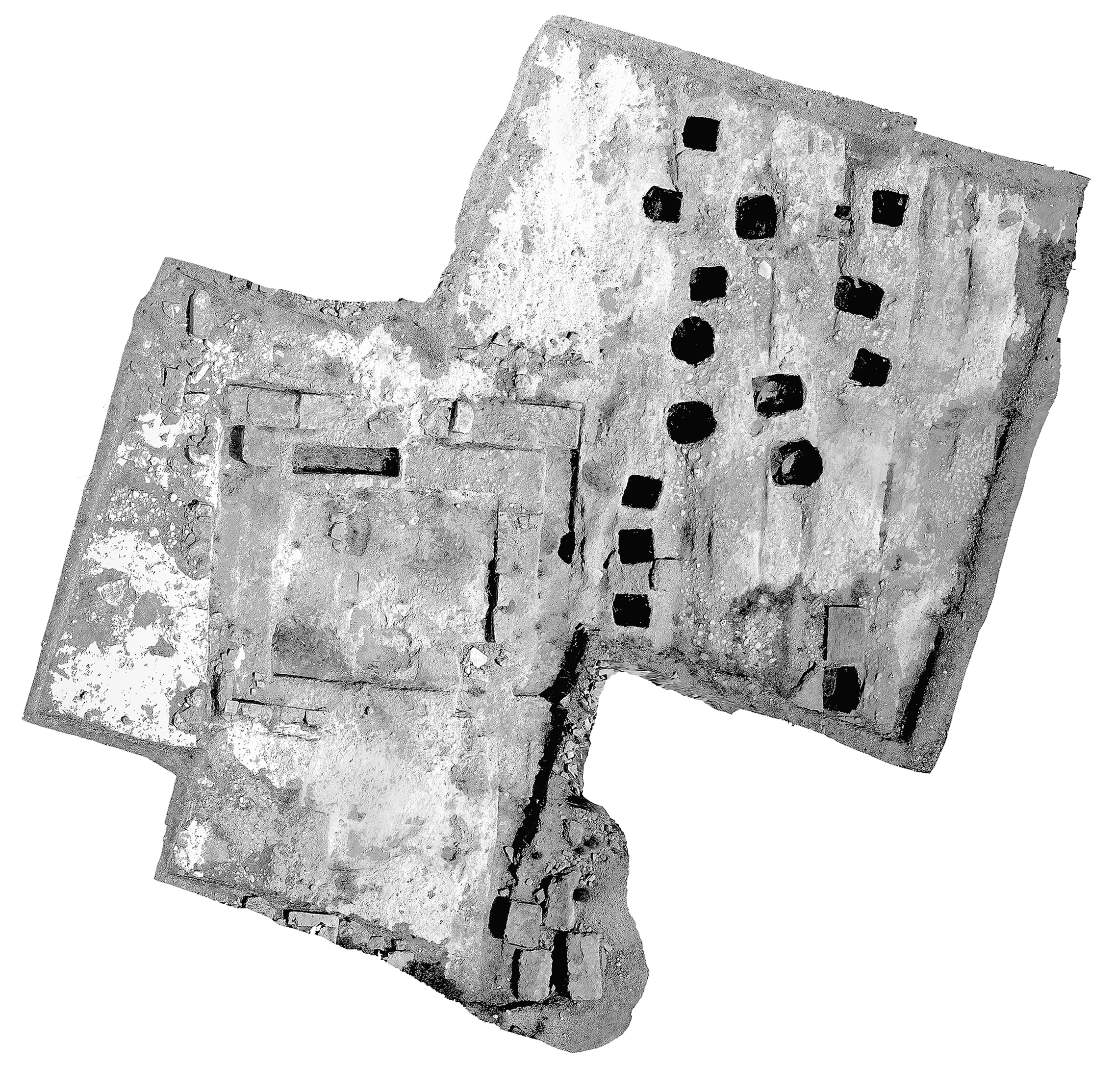 Aerial view of Building C1, showing the cartroad and graves, north at top (S. Copp)