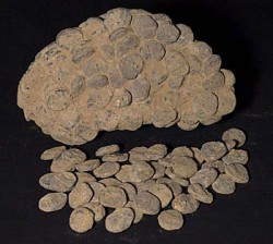 Once out of the ground, the hoard was brought directly to the conservation laboratory. Here, each of the 46 loose coins was weighed, and it was noted that although they are not similar in shape they are remarkably similar in weight. The total weight of the lump was then divided by the average weight of the loose coins and it was estimated that the hoard consists of approximately 400 coins.