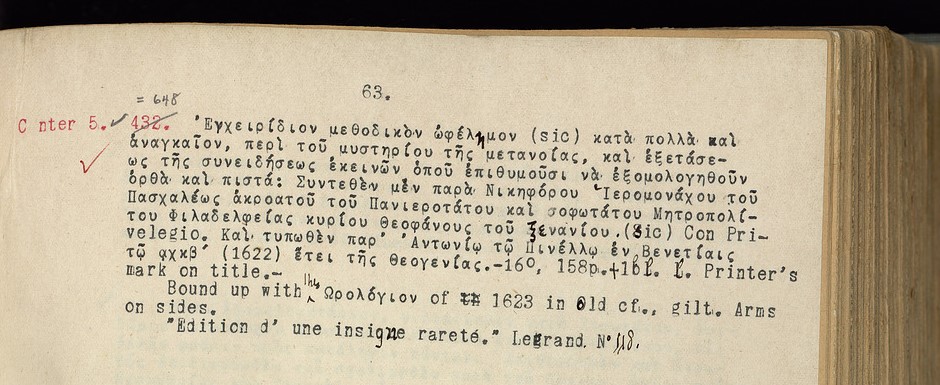The typewritten catalog of the personal library of Joannes Gennadius (Theology, approximately 6000 editions), contains a category of liturgical texts, including some editions of Confessions. The Encheiridion Methodikon holds a prominent place among them.