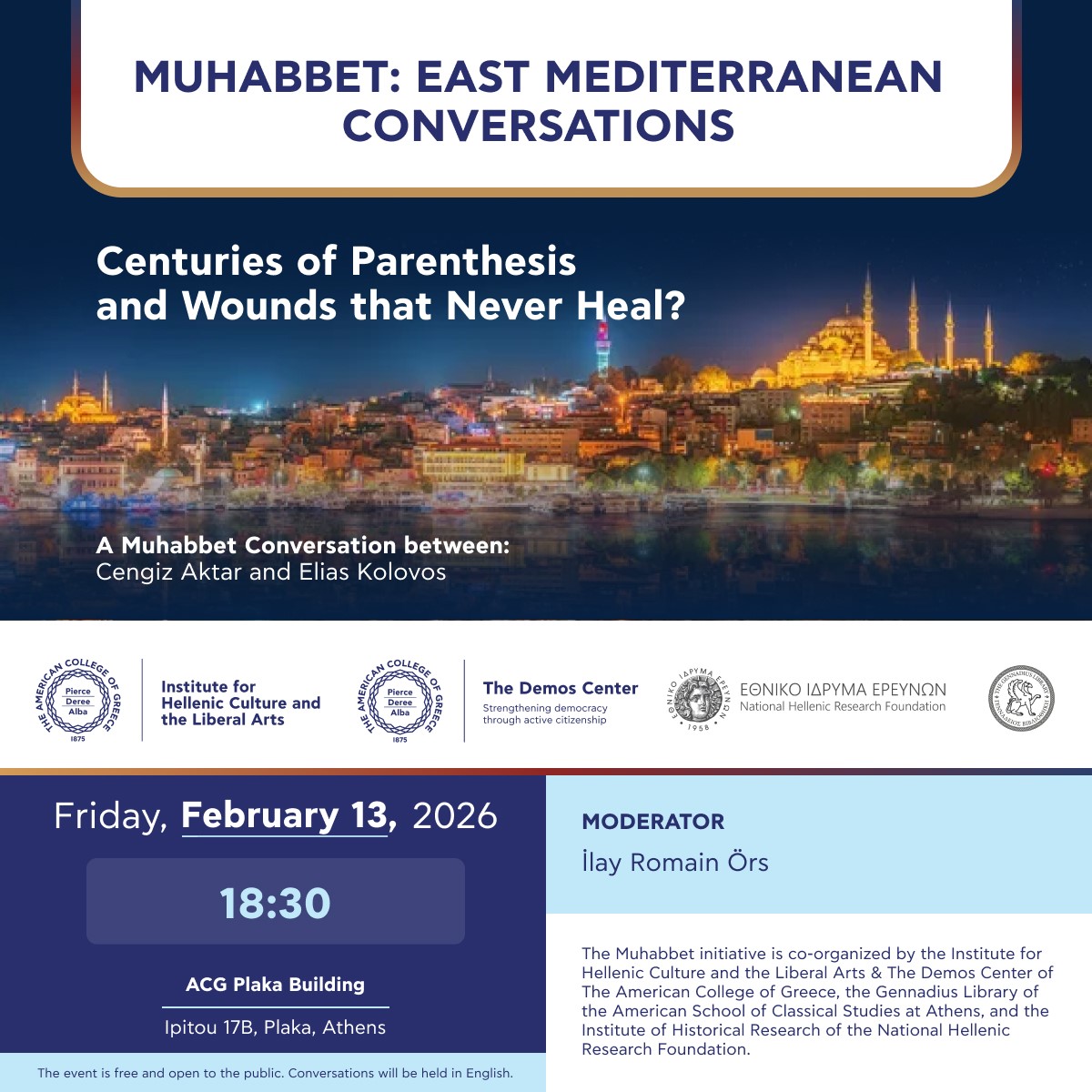 Την Παρασκευή, 13 Φεβρουαρίου 2026, ώρα 18:30, στο The Demos Center, Ηπίτου 17, Πλάκα, Αθήνα, θα διεξαχθεί η επόμενη συνάντηση του νέου κύκλου της πρωτοβουλίας Muhabbet: Συζητήσεις για την Ανατολική Μεσόγειο, την οποία συνδιοργανώνει το Ινστιτούτο Ιστορικών Ερευνών του Ε.Ι.Ε., μαζί με το Institute of Hellenic Culture and Liberal Arts, The American College of Greece, και την Γεννάδειο Βιβλιοθήκη, Αμερικανική Σχολή Κλασικών Σπουδών στην Αθήνα.