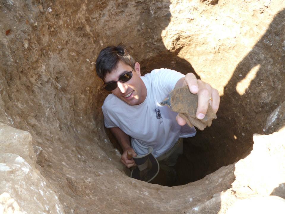right: Nathan Arrington with finds from the bottom of a well at MTAP in 2015 (Photo A. Weaverdyck)